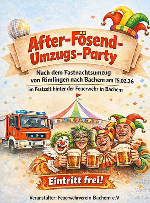 Am 15.02.2026 findet wieder die After-Fösend-Umzugs Party in Bachem im Festzelt auf dem Kirmesplatz hinter der Feuerwehr statt.
